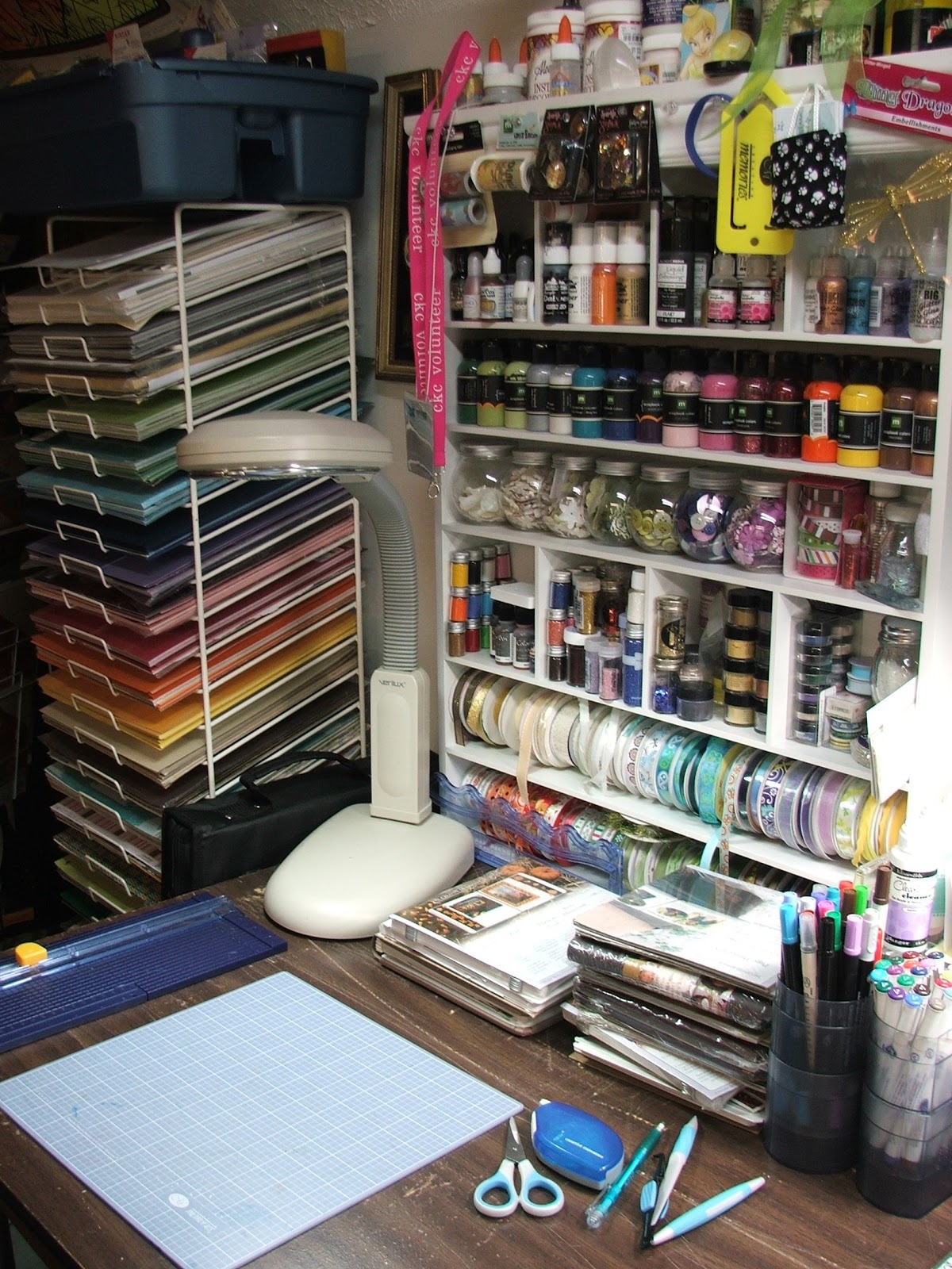 I took out the second desk that was on this side because it just collected clutter. I rearranged some containers I already had elsewhere. I feel I have more room and it looks more organized. I know it is still very cluttered compared to the neat white rooms in new homes that I see on other blogs.