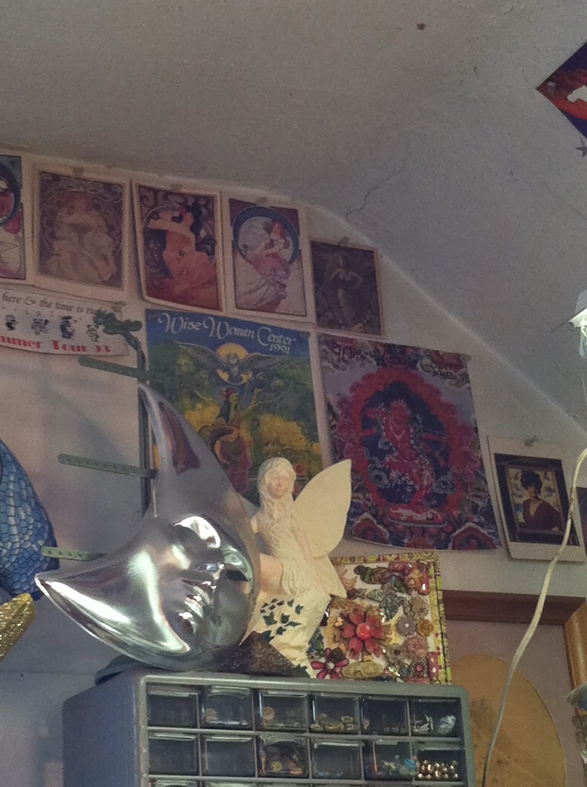 A half way finished ceramic fairy....someday! One of my first altered cigar boxes is behind it. Lots of brooches, beads and broken jewelry on it.