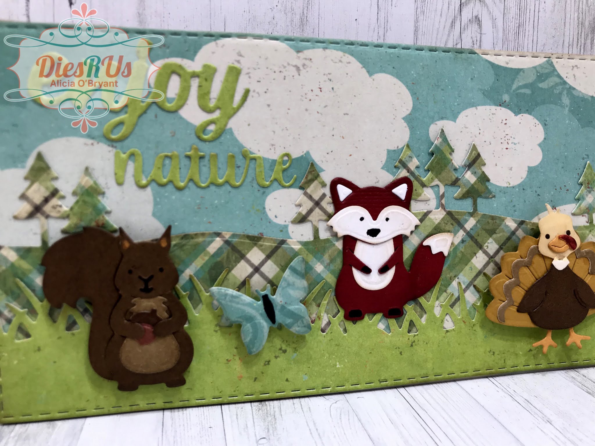 I love creating the Karen Burniston Critters, they are so much fun and most are a lot easier than they look. The squirrel below is only two pieces. I used a pen and the die to ink the ears and face. I inked the edges with a brown ink and added the tiny acorn. The fox is a few more pieces. Most of the details are highlighted with ink as well. I did cut an extra body to get the white pieces for the inside of the ears. You could just put white paper behind but I felt the inlaid die cut is a more finished look.